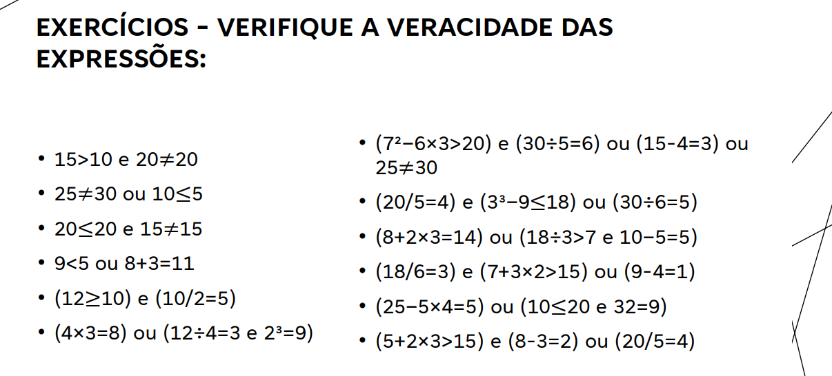 Descrição professor: Exercícios sobre os tipos de comunicações lógicas entre elementos na programação. Desafie-se com esses exercícios de operadores.