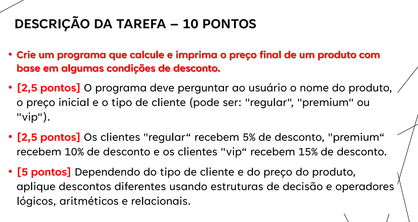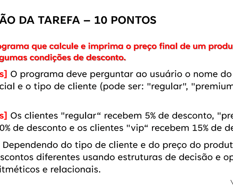 Descrição professor: Essa lista contém diversos exercícios práticos para você desenvolver. Realize-os para complementar ou recuperar sua nota da prova 1 em Lógica de Programação. Aproveite e exercite mais seus conhecimentos e sua lógica. Exercitar desenvolve seu raciocínio e análise lógica de problemas.