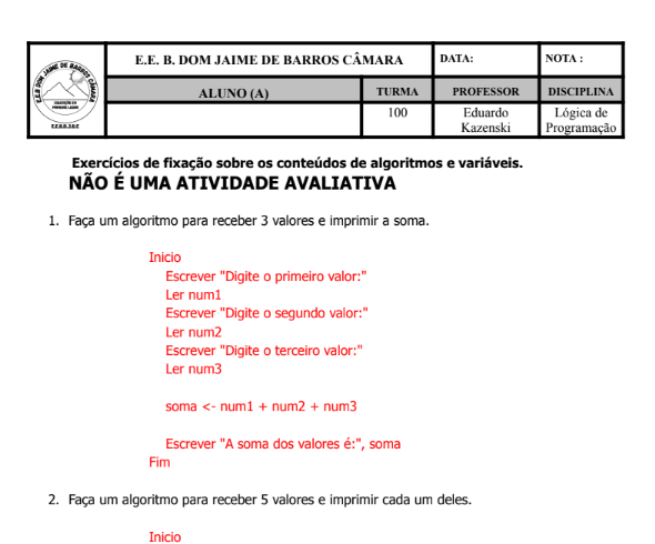 Assunto: Algoritmos e Variáveis