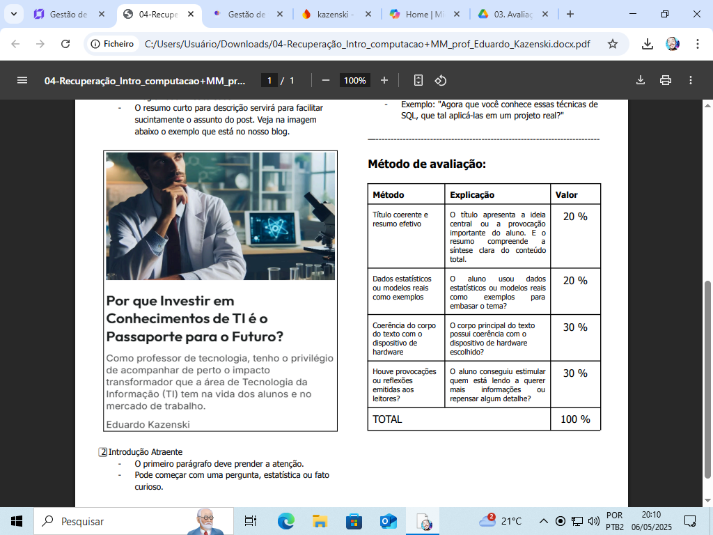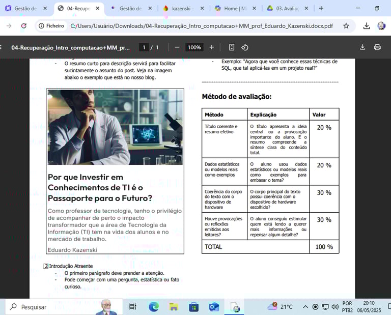 Descrição professor: Este matéria contempla a recuperação das disciplinas de Introdução à Computação e Montagem e Manutenção. Será em formato de escrita de blog sobre determinado tema. Esses temas serão dispostos no dia da aplicação e a recuperação será aplicada presencialmente no laboratório e entregue escrito manualmente.