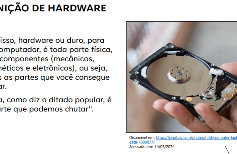 Conteúdo: Aqui temos a descrição básica e introdução aos componentes essenciais aos computadores, bem como o uso e conceito dos mesmos.